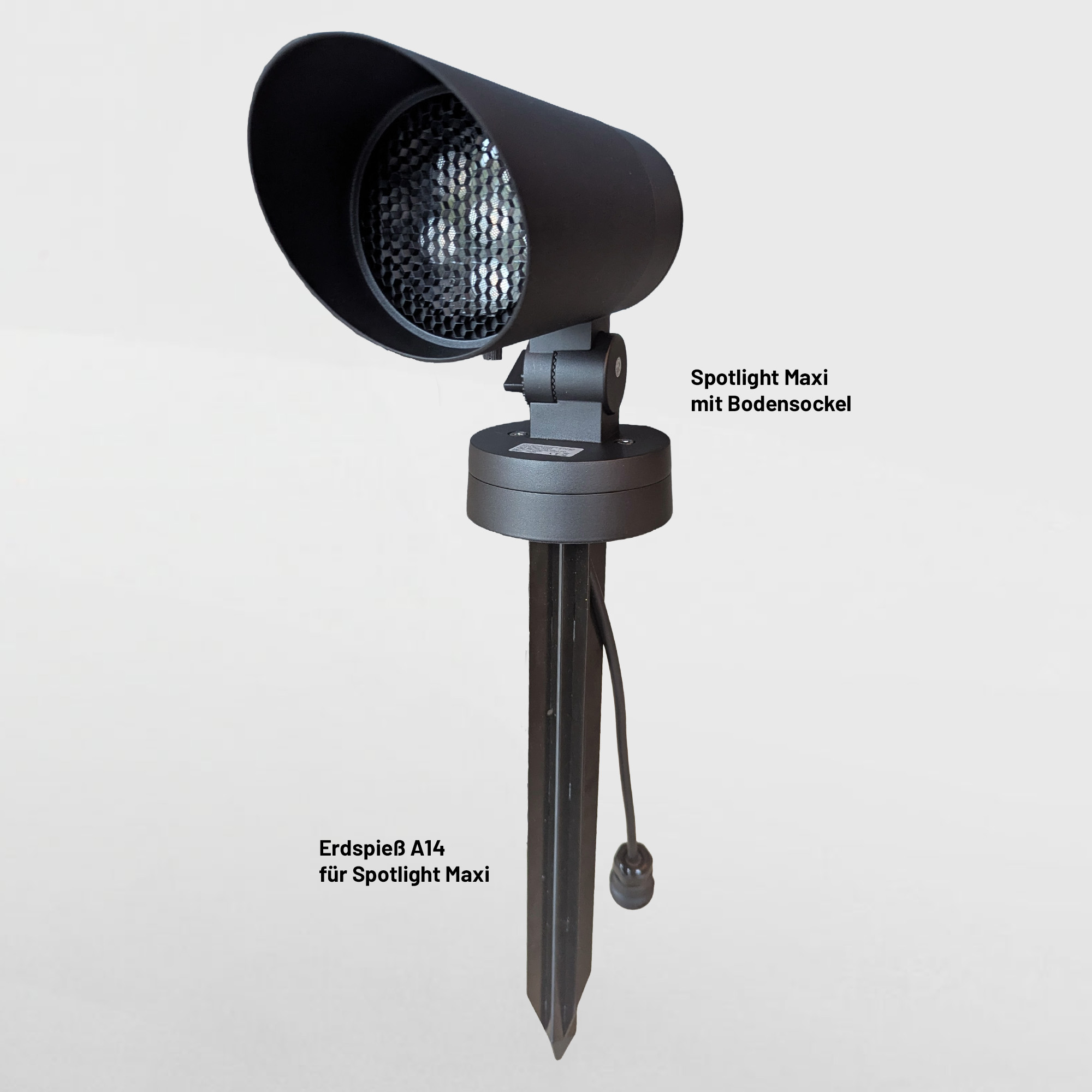 Mit diesem Erdspieß lässt sich die Spotlight Maxi nachrüsten. Einfach mit dem vorhandenen Sockel verschrauben.